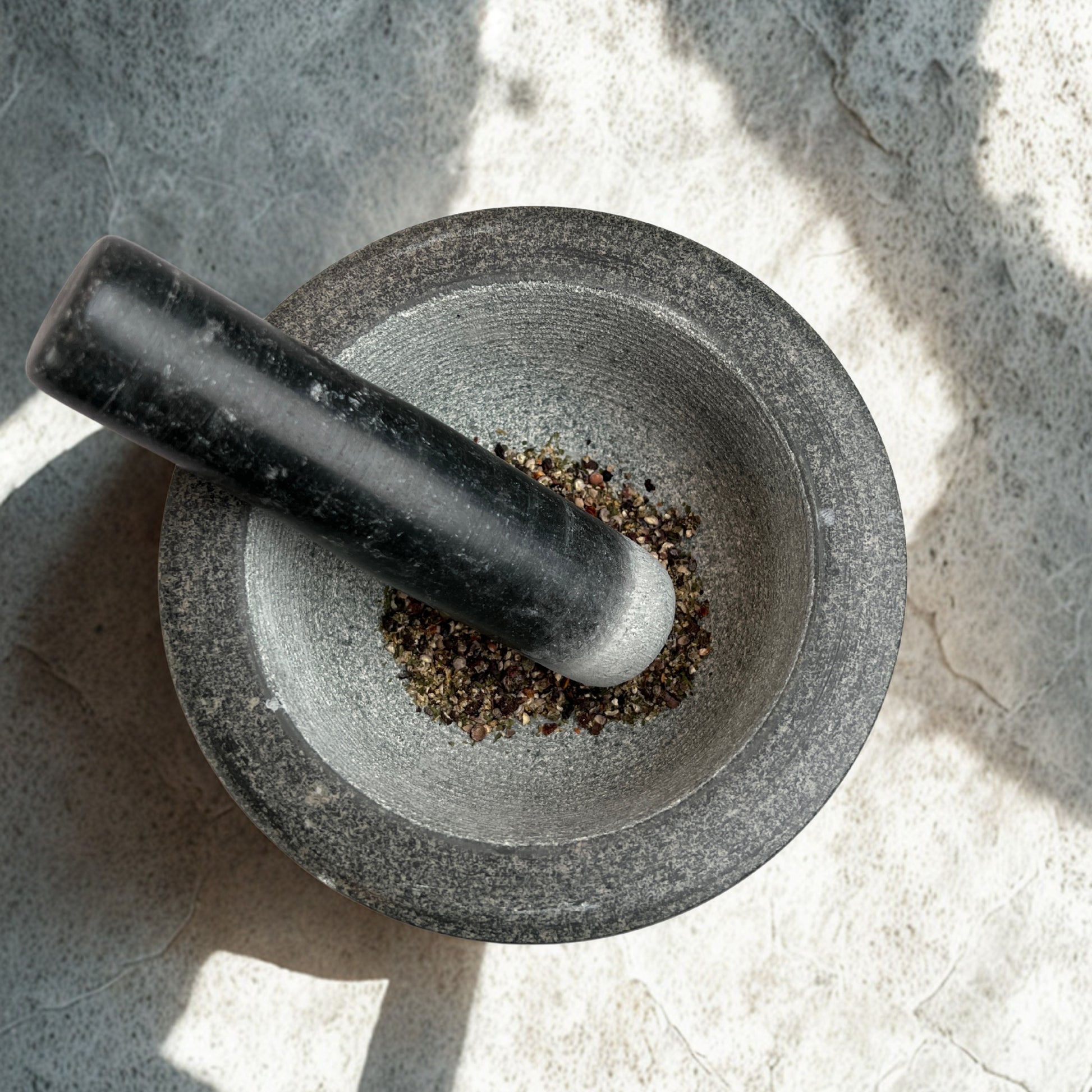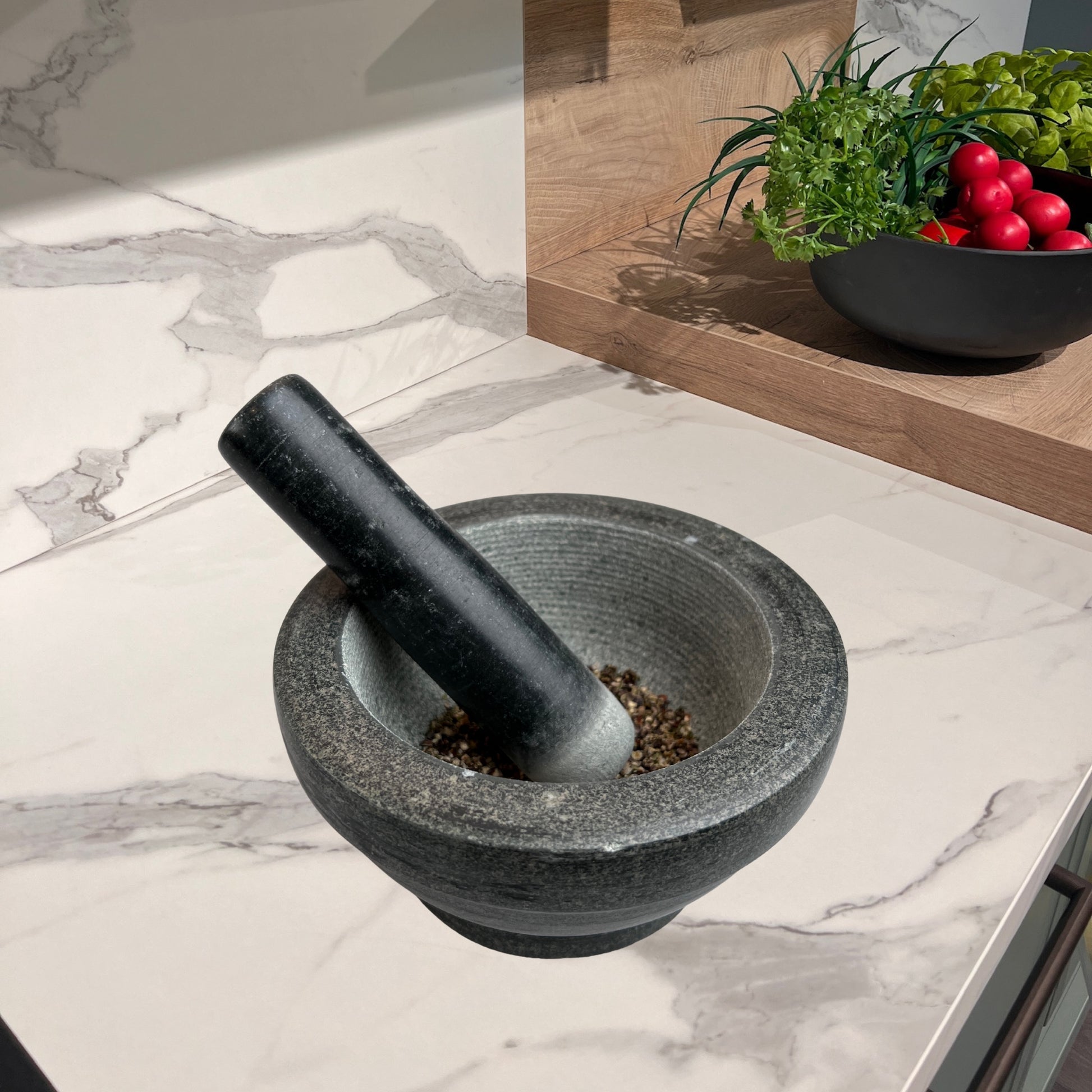 Entfessele das volle Aroma deiner Gewürze mit dem Mörser Comet, dem idealen Küchenhelfer für leidenschaftliche Köche. Gefertigt aus echtem Granit, überzeugt er durch seine robuste Bauweise und ansprechende Optik. Der schwere Granitfuß sorgt für optimale Standfestigkeit, während die glatte Oberfläche das volle Aroma deiner Zutaten freisetzt. Perfekt für die Zubereitung von Gewürzmischungen, Marinaden oder Pestos.