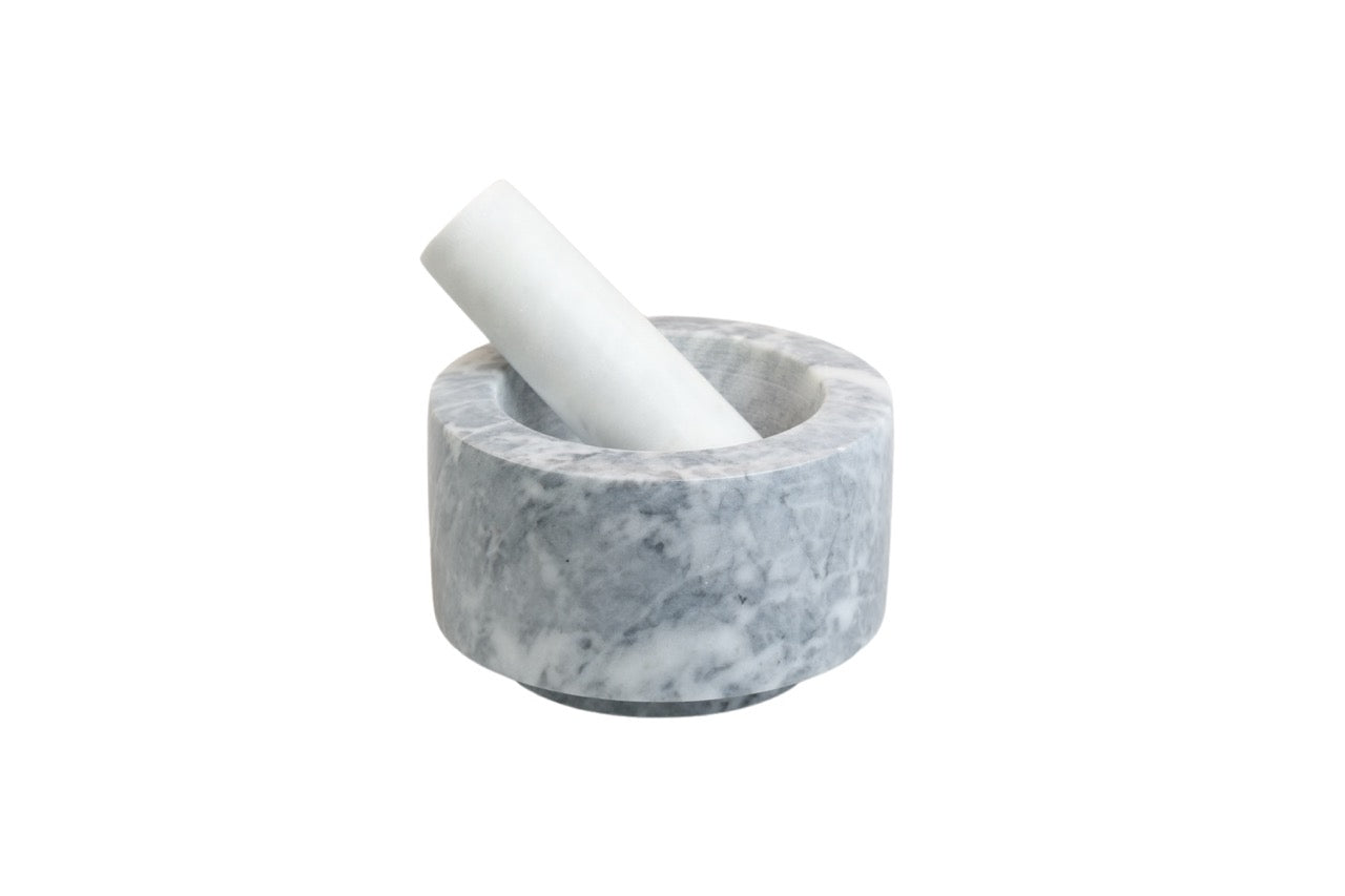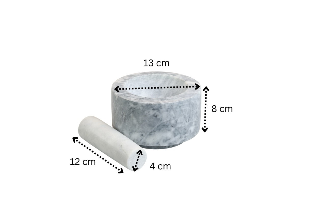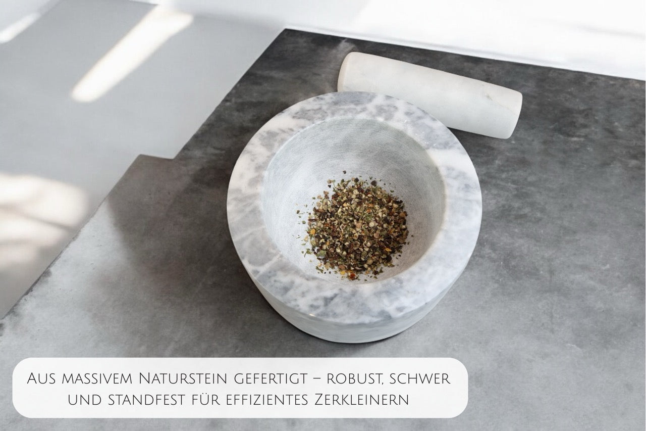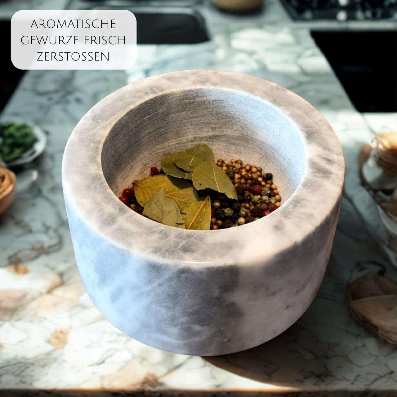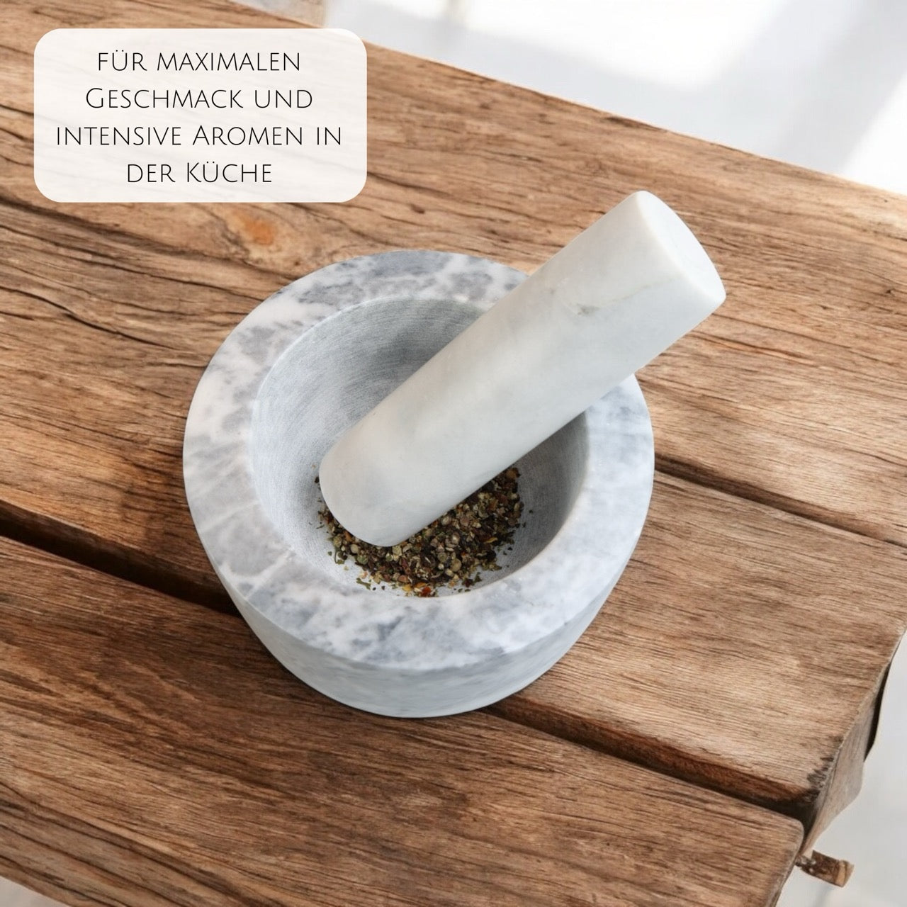 Verleihe deiner Küche einen Hauch von Eleganz mit dem Mörser Meteor. Aus echtem Marmor gefertigt, verbindet er edles Design mit außergewöhnlicher Funktionalität. Der schwere Mörser und Stößel sorgen für optimale Standfestigkeit und machen das Zerkleinern von Gewürzen, Kräutern und Nüssen mühelos. Egal, ob du eigene Marinaden, Pasten oder Gewürzmischungen herstellen möchtest - der geschmacksneutrale Marmor bewahrt die natürlichen Aromen deiner Zutaten.